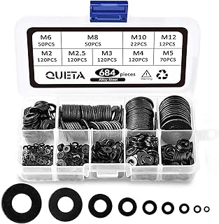 Queta 684pcs Flach Unterlegscheiben 9 unterschiedlichen Typen der Unterlegscheiben M2 M2.5 M3 M4 M5 M6 M8 M10 M12 Scheiben und Sicherungsscheiben,Beilagscheiben Sortiment Set Kohlenstoffstahl