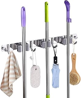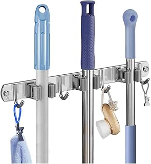 Wandhalterung für Besen und Mopp, robust, mit 3 Racken, 4 Haken, Mop- Besen-Aufbewahrung, Organizer, Aufhänger, Metall Edelstahl, Wandmontage, Organizer Werkzeuge Garten, Bad, Küche, Büro, Schrank...
