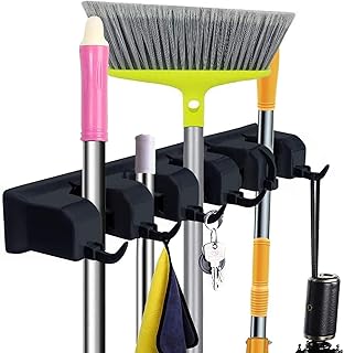 CINEYO Wandhalterung für Mopp und Besen, robust, zur Wandmontage oder als Werkzeug-Organizer für Zuhause, Garten, Garage und Aufbewahrung (5 Positionen mit 6 Haken) (schwarz)